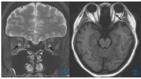 图1冠状面T2WI示双侧视神经鞘扩张。图2横断面T1WI示眼球后部变平,左侧视神经走形扭曲。