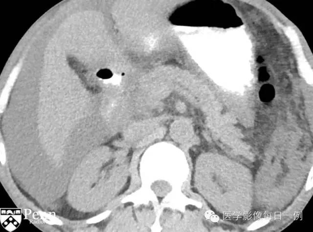 胰腺周围可见液体及线条影在平扫及增强均显示。