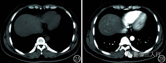 图 2 厚壁环形强化型 IPL 。 图 2A平扫病灶边界不清 ,低密度为主 。 图 2B 动脉期 ,病灶边缘明显环形强化 。 图 2C 延迟期 ,病灶呈厚壁全瘤强化 ,中心见条片状低密度不强化区