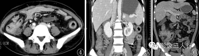 图 6 男 , 36 岁 。 Crohn 病 。 回肠末段及升结肠肠壁增厚 、粘连 ,肠腔狭窄 ,升结肠分层状强化