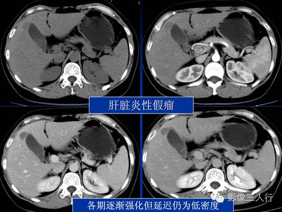 CT平扫:表现肝脏实质内可见孤立或散在的低密度影,直径约小于3.0cm,其形态多样,以类圆形多见,病灶边缘清晰或模糊; 动脉期:炎性假瘤多无直接的动脉供血,所以动脉期多强化不明显; 门脉期及延迟期:①病灶不均匀强化,周边环形强化(表明病灶中心血管较少,中心以凝固性坏死,炎性细胞浸润为主);②病灶均匀强化(表明病灶内血供丰富,大量炎性细胞浸润和纤维组织相互夹杂);③病灶无强化(表明病灶内血管无或较少,以大量凝固性坏死为主,多伴少量的炎性细胞浸润)。 |