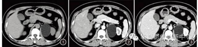 本病多无症状,多为体检或其他疾病检查时偶然发现,但当囊肿较大时会引起腰背部不适、腹部肿块、胃肠功能紊乱等症状,破裂出血时也会引起急腹症。本组中例1表现为左侧腰部隐痛;例2无临床症状,因体检发现右肾上腺占位而行CT检查。