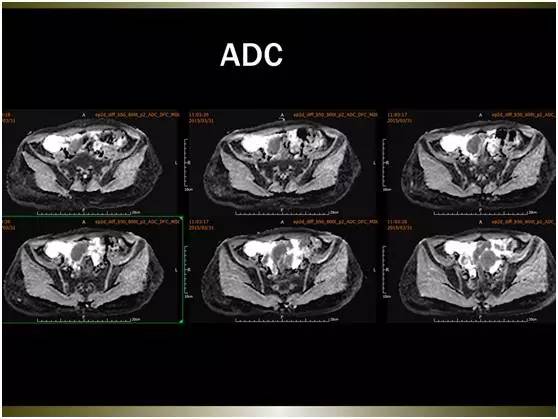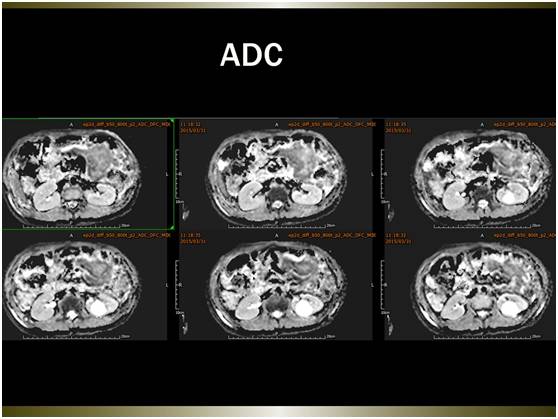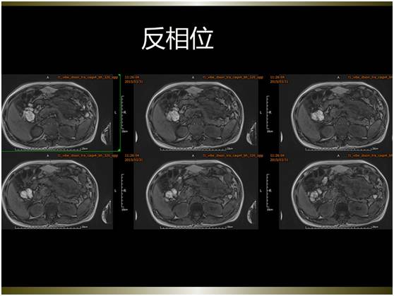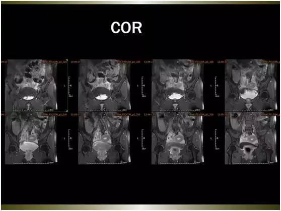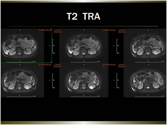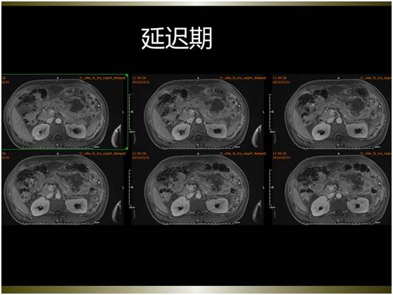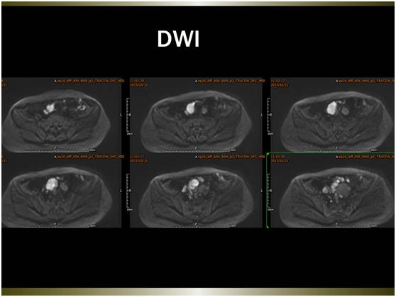 大网膜、脏壁腹膜可见弥漫性大小不等略长T1略长T2异常信号,边界不清,FS-T2WI呈高信号,FS-T1WI呈略低信号。注入GD-DTPA后病变明显强化。