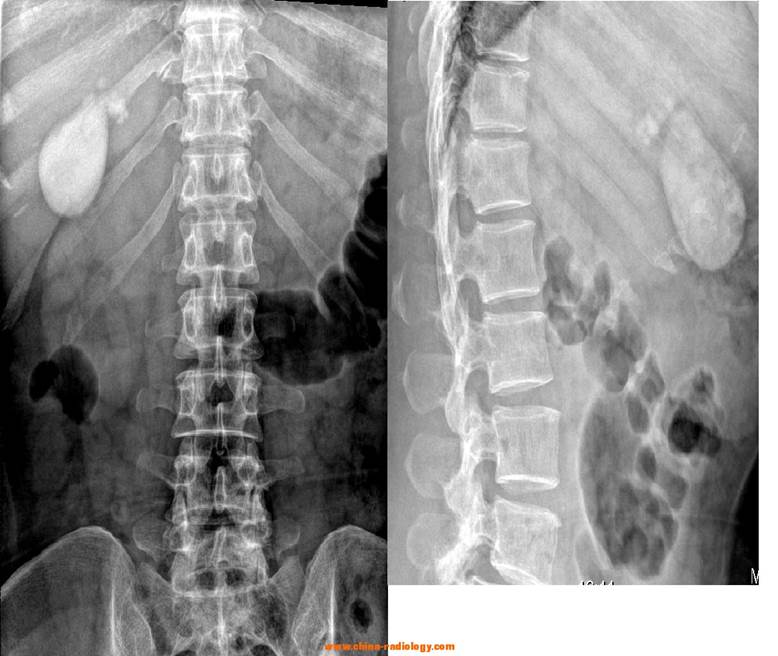 下图,男性,46岁,反复右上腹痛20余年加重10天,为持续性钝痛,不向它处放射,无恶心及呕吐;无发热及黄疸。对症治疗缓解。以后右上腹痛反复发作,与进食无明显关系。每2~3年发作1次。