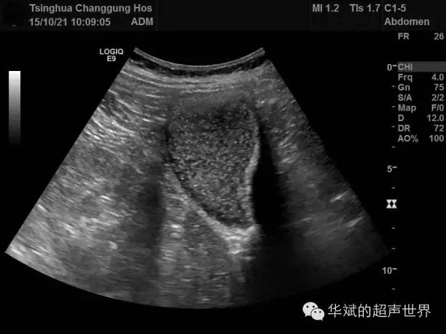 图1 胆囊钙乳症。胆囊内可见浓缩的胆汁与伴有明显声影的钙乳之间的强回声分界线。