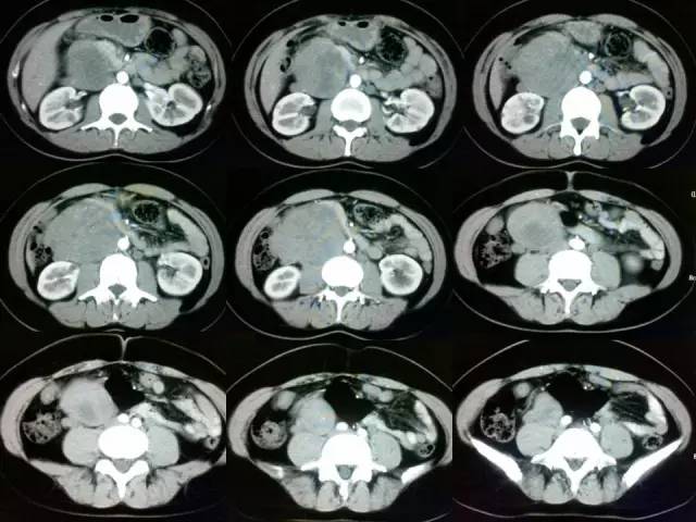 胰腺钩突下缘至右肾下极平面腹膜后内可见大小约8.3 cm×12.6的实行软组织密度肿块,增强边缘强化,其内可见无强化坏死区。肠系膜上动脉参与供血。十二指肠水平段受压向前上抬,肠系膜上动脉及上静脉受压左侧以为,内后侧紧贴腹主动脉,与腰大肌分界消失。