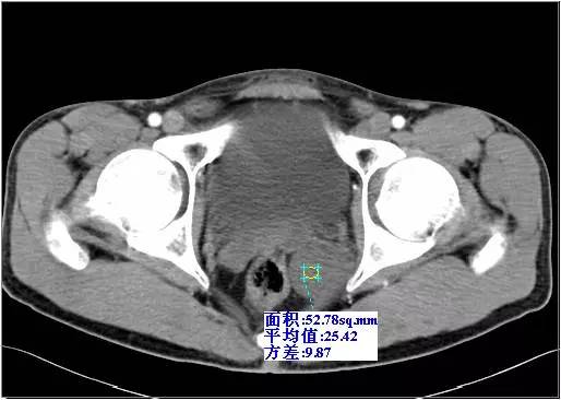 影像检查:超声示盆腔内直肠中段左侧见一肿块图像,大小约4.4 cm×5.0 cm×3.2 cm,形状呈椭圆形,边界欠规整,内部为低回声,分布不均,后方回声无变化,彩色多普勒显示肿块内部可见少许点状血流信号。