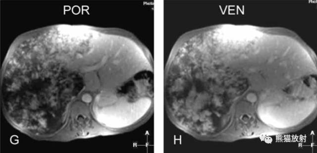 G、H:门脉期及静脉期:大病灶呈渐进性不均质强化。