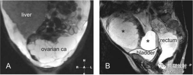 B、冠状T2WI:卵巢癌包含多个囊实性肿物(星号);