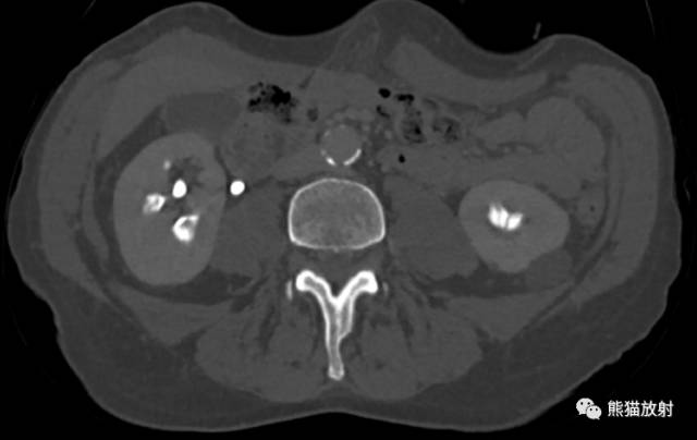 病史补充:患者之前患有镜下血尿及肾结石。回顾PACS中2005年的静脉尿路造影(IVP)图像,腹部平片及造影后图像图像所示。