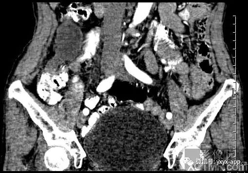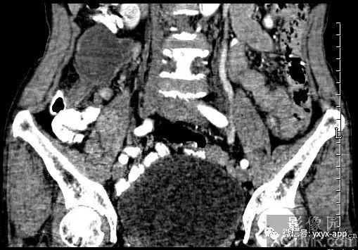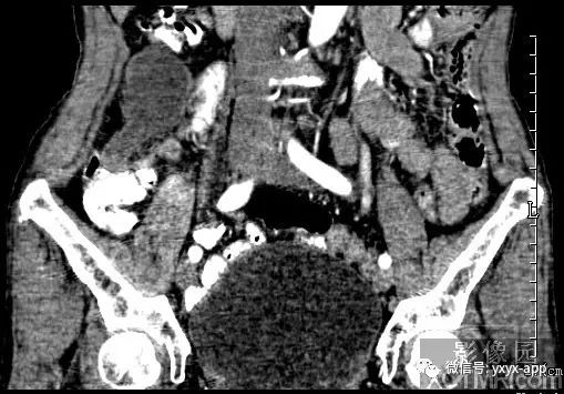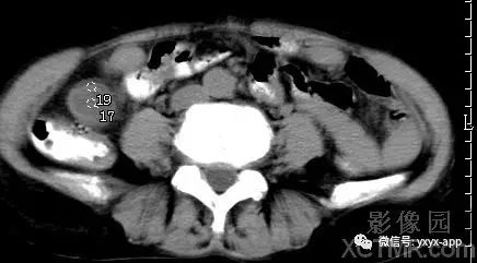 CT影像表现:右下腹囊性肿块,囊液密度均匀,囊壁规整,增强囊壁有强化,周围肠腔无梗阻征象,考虑阑尾粘液囊肿或肠系膜囊肿。