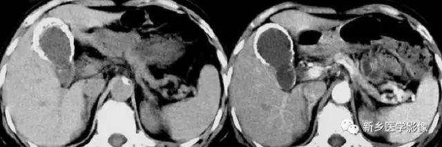 可完全钙化,也可以表现为环形钙化,如胆囊切除术也可以导致结石脱落至肝下隐窝。