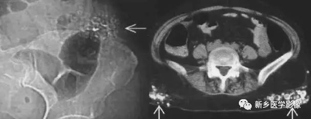 主要表现为腹腔内弥漫性的小的、多发的钙化。大小可不一致。