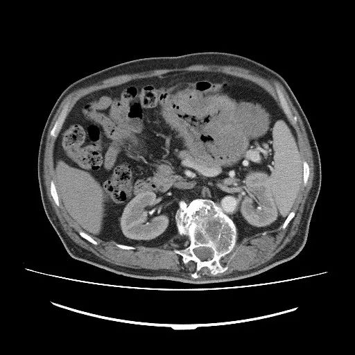 男,68岁。胃部胀痛不适2月余,查体:锁骨上未触及肿大淋巴结,双肺呼吸音清晰,未闻及啰音,心率80次/分,律齐,心音有力,未闻及杂音,腹部平坦,未见胃肠型及蠕动波,腹部软,上腹部压痛,反跳痛及肌紧张,肝脾未及,未触及腹部包块,叩鼓音,肝区及双肾区无叩击痛,肠鸣音正常存在。双下肢无水肿。