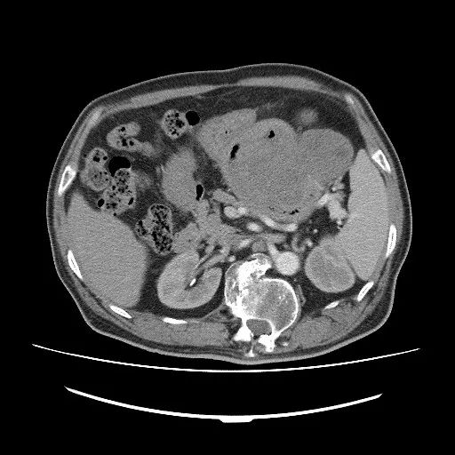 CT检查:CT扫描能够对GI无法完整显示的向腔外生长肿瘤的形态,大小清晰显示,尤其是多期增强扫描除了可以清晰的显示胃肠道管腔、管壁及肿块的形态外,还可以同时对管腔内的情况进行观察。扫描主要表现为胃肠道壁局限性增厚及软组织肿块,肿块呈圆形或分叶状,肿块大小多为4.5~8.5cm,随肿块增大,出现坏死、囊变或钙化率增高,导致密度不均匀,增强检查实性软组织成分多呈中度或明显强化,坏死囊变区无强化,肿瘤与周围组织器官界限模糊,可见存在侵袭性,如发生转移则支持恶性GIST。