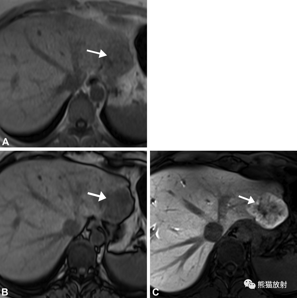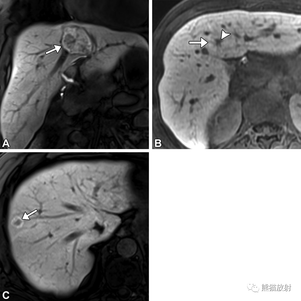 肝胆期FNH的其他摄取模式。(A)47岁女性,肝胆期FNH表现为不均质高信号;(B) 27岁女性,肝胆期FNH表现为均匀等信号(箭)并低信号中央瘢痕(箭头)。(C)65岁男性,FNH表现为外周环状摄取(箭)。