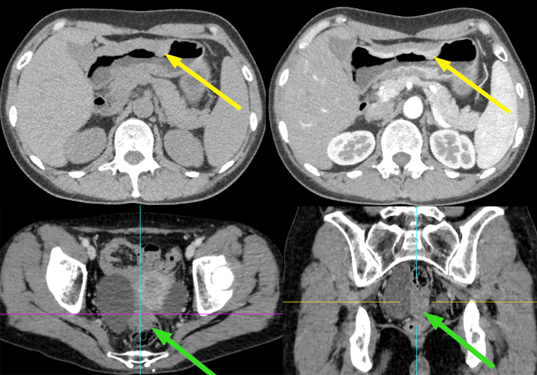 影像描述:胃腔充盈尚可,贲门、胃小弯、胃体下部、胃角壁弥漫性增厚,不均匀明显强化,胃小弯侧浆膜层毛糙,周围脂肪间隙略浑浊,见结节样软组织影,大小约 0.8-1.0 cm,轻度强化。右侧附件区见团块状囊实混杂密度影,可见强化,与直肠分界不清。