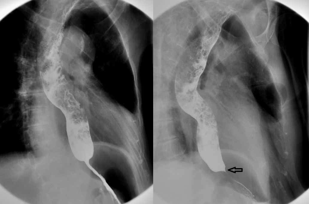 ③狭窄段以上食管不同程度扩张,扩张程度与贲门狭窄程度相关。