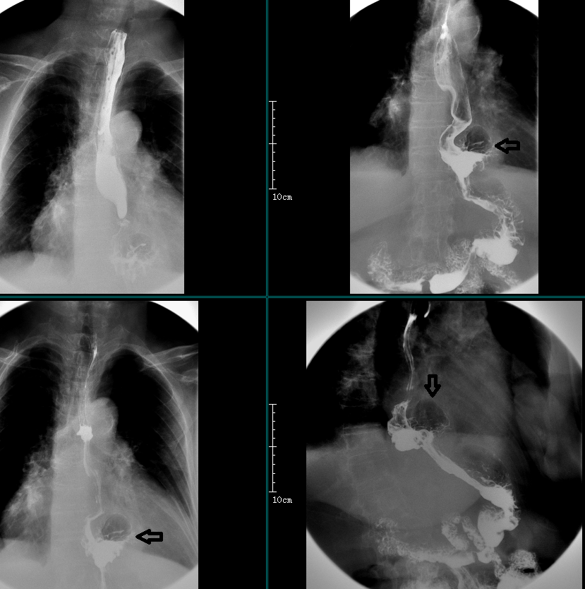 X 线吞钡后的食管造影表现为:早期下段食管黏膜皱襞增粗或稍迂曲,管腔边缘略呈锯齿状,管壁软,钡剂通过良好。进一步发展,典型者为呈串珠状或蚯蚓状之充盈缺损,管壁边缘不规则,食管腔扩张,蠕动减弱,排空延迟。