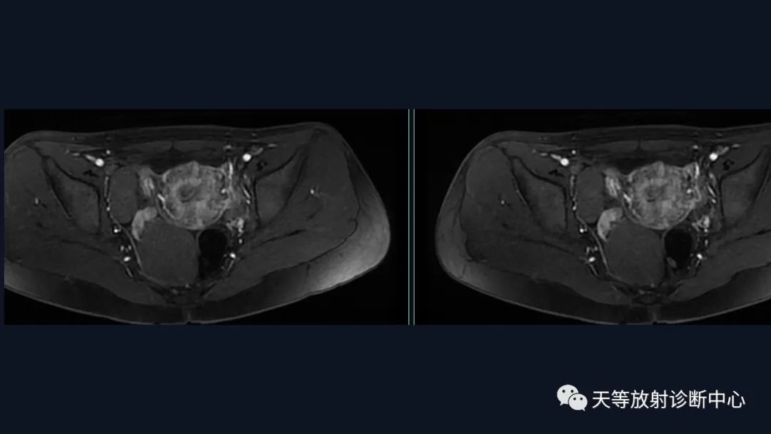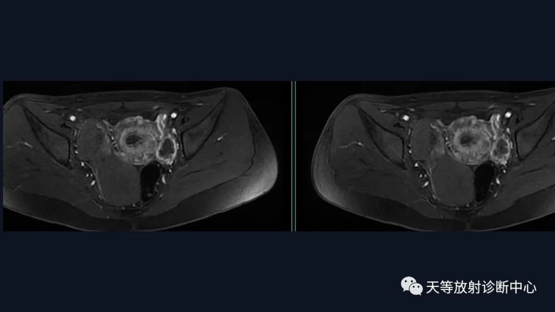另外左侧附件区见管状结构及结节状异常信号影,彼此相连,T1WI呈低信号,T2WI稍高信号,DWI呈稍高信号,边界清楚,较大结节直径约30mm。