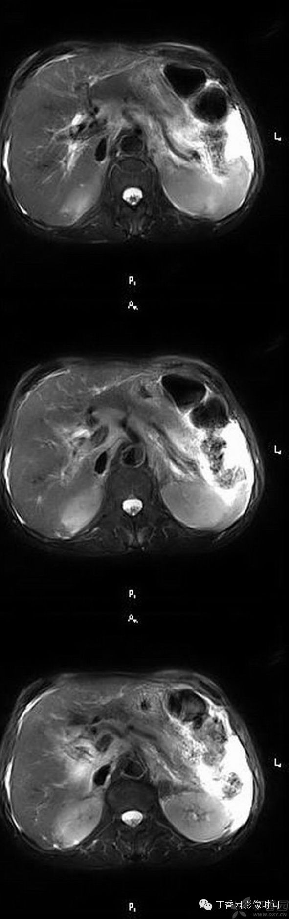 病例三:女,40岁,乳腺癌术后3月。肝内多发转移灶,脾大,胆道扩张,肝门区多发迂曲的血管影。
