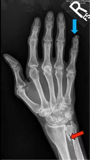 图 2 为右手斜位,可见临近尺骨近端一线性钙化(蓝色箭头)。腕部背侧仍可见钙化(红色箭头)。第一和第三掌指关节可见半脱位