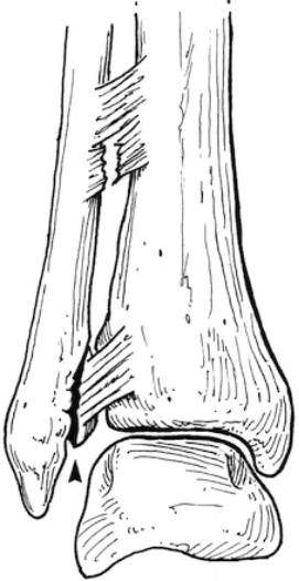 下胫腓前韧带在腓骨远端止点处的垂直撕脱骨折。