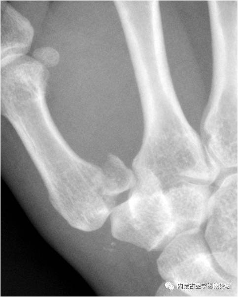 Bennett骨折:第1掌骨基底部骨折并累及掌腕关节面,可见移位的骨片。注意不应误认为副骨或籽骨。