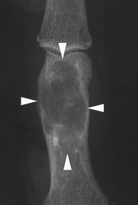 图4.-内生软骨瘤。52岁男性的射线照片显示,中指近节指骨病灶轻度膨胀生长,边界清晰,且有硬化(箭头)。