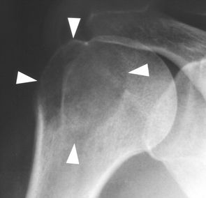 图2A-软骨母细胞瘤。16岁女孩的射线片显示典型的肱骨近端骨骺的软骨母细胞瘤(箭头)。