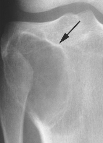 图2B-软骨母细胞瘤。16岁男孩胫骨近端干骺端和骨骺(箭头)有非硬化边缘, X线外观很像巨细胞瘤,但是由于年龄较小,不能明确诊断为典型的骨巨细胞瘤。