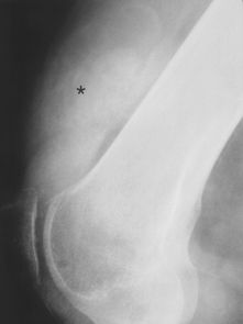 图14B -66岁男性,色素沉着绒毛结节性滑膜炎。膝侧位X线片显示髌上囊有异常密集的关节积液(星号)。