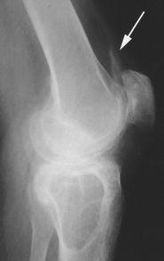 图16B-30岁男性,血友病假瘤。如A中所示的相同膝关节的侧位X线照片显示了近端胫骨病变(箭头),以及提示含铁血黄素沉积的小但异常致密的关节积液(或滑膜)。