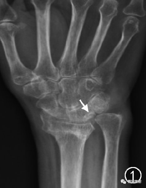 图2 尺骨正向变异所致尺骨撞击综合征。男,48岁,右腕关节疼痛。腕关节X线正位片示尺骨正向变异,月骨近端尺侧面骨质硬化囊变(↑)
