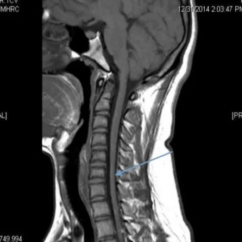 颈椎核磁共振在这种罕见疾病的诊断中起着重要的作用。矢状位磁共振成像显示细微的局灶性颈髓萎缩(图2 & 3),尤其是在下颈部。屈曲位成像示硬脑膜的前移位,后硬膜外腔增宽(图4)和更明显的脊髓变细,这在中立位不明显(图5)。