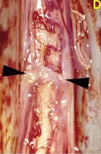 患者的MRI、术中及蛛网膜网带切除术后照片;在T5-9椎板切除术中,切开后部硬脊膜后,所示解剖结构见下图D。术中切除异常病灶后,所示胸髓见下图E。此外,术中还对前部硬脊膜进行了探查,未发现腹侧硬脊膜缺损(ventral dural defect),也未发现腹侧脊髓疝(ventral spinal cord herniation)。