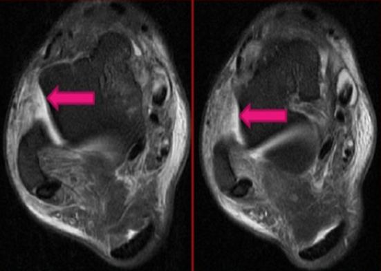 MRI显示三角骨内骨髓水肿,邻近关节囊积液,软组织水肿级炎症,拇长屈肌腱水肿、腱鞘积液。