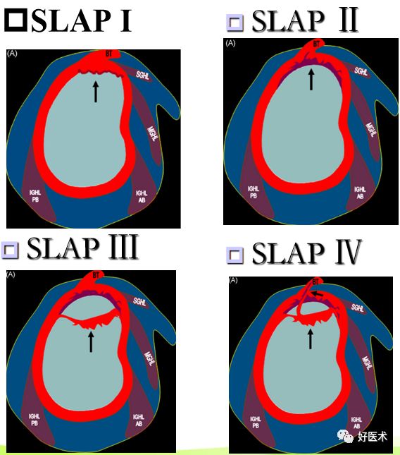 上盂唇前后向(Superior Labrum Anterior to Posterior ,SLAP)损伤,是由肱二头肌附着处前方延伸至其后方的上盂唇撕裂