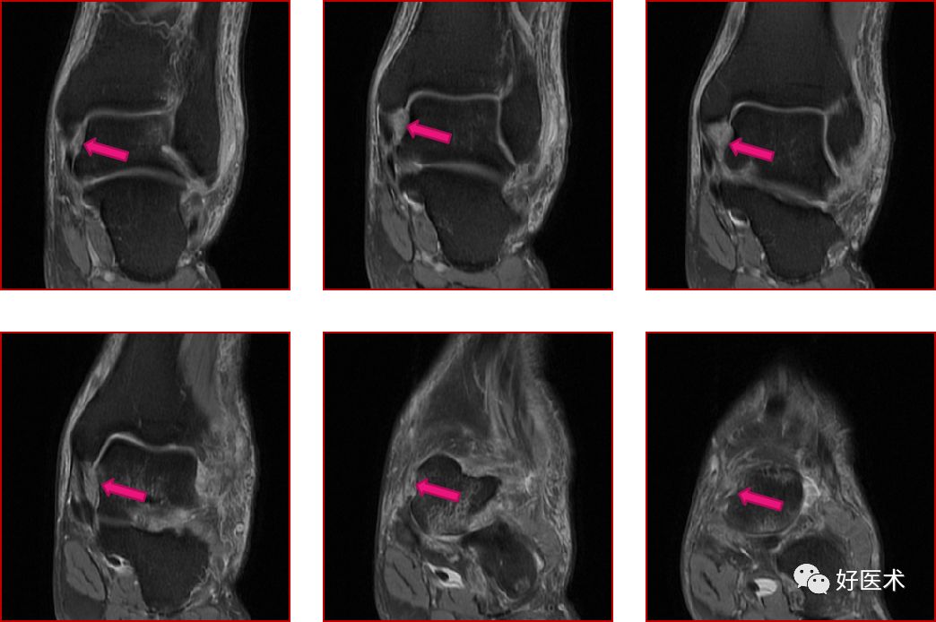 距骨骨软骨损伤,好发于前外侧、后内侧,尤其是后内侧,与内外翻损伤相关。