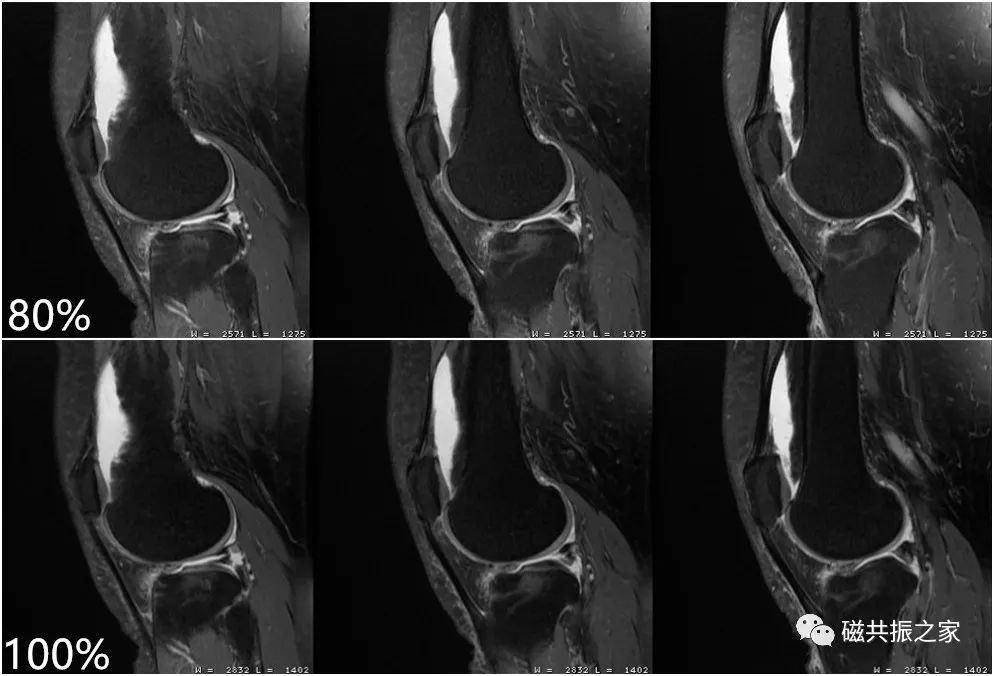 MRI的信号主要来自于水和脂肪中的氢质子,虽然较强的压脂程度可突出某些组织间的对比,但更多的脂肪被抑制掉,图像的SNR会下降,图像会更“黑”,则不利于我们做更高分辨率的图像。在进行膝关节的小体素扫描时,使用部分压脂则可以保证图像足够的信噪比。如上图的压脂程度为80%,下图的压脂为100% 。