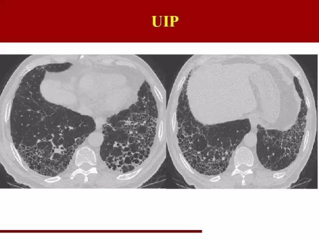 双肺中下肺野胸膜下分布、网格状阴影多于磨玻璃阴影,终末期可以有蜂窝肺形成,伴有牵拉性支气管扩张
