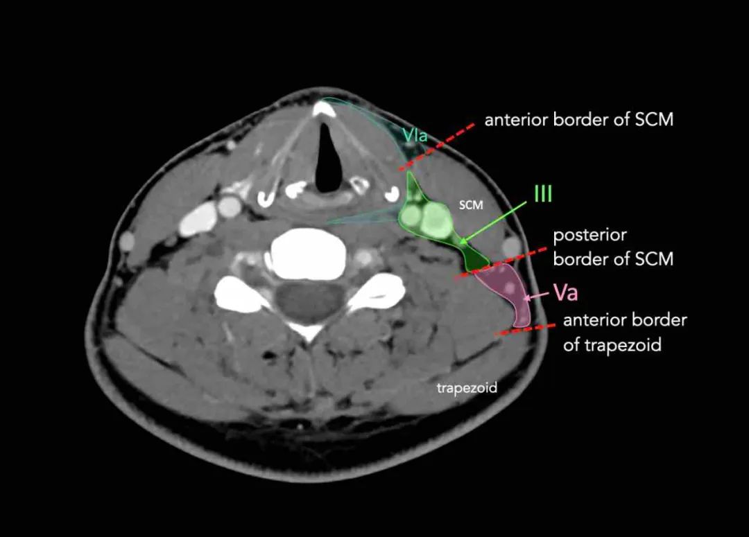 第五层的淋巴结通常与鼻咽、口咽、头皮后部的皮肤结构和甲状腺的原发癌有关。