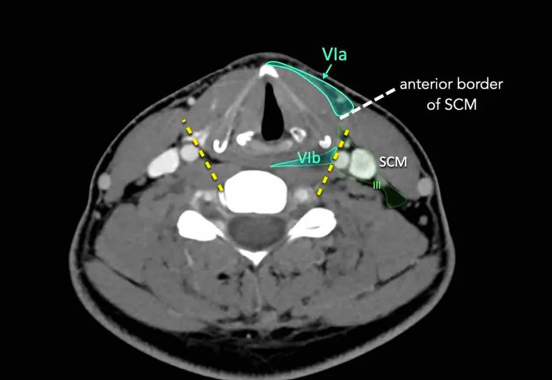 这一层包括浅表的颈前淋巴结(VIa层)和较深的喉前、气管前、气管旁和喉返神经淋巴结(VIb层)。