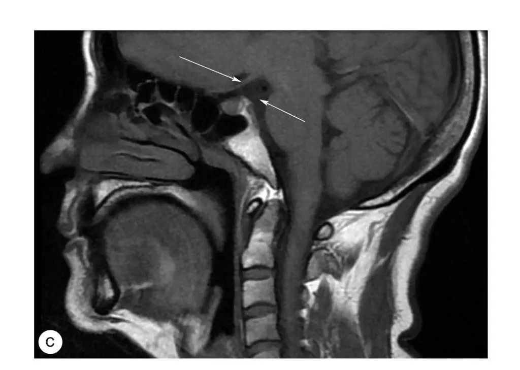 A.视交叉(白箭);B.视神经(上方白箭),视交叉(下方白箭);C.矢状面视交叉(白箭)