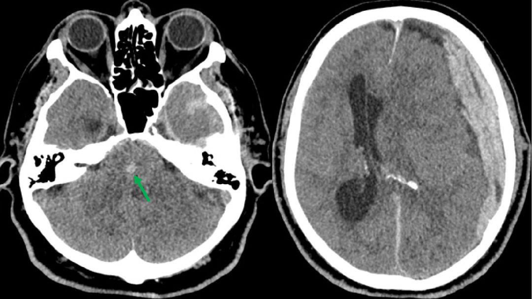 男,54 岁,头部外伤入院,2022-2-12 显示左侧额颞顶部硬膜下血肿,继发大脑镰下疝。2022-2-13 去骨瓣清除硬膜下血肿发现中脑新发出血(绿箭头)。