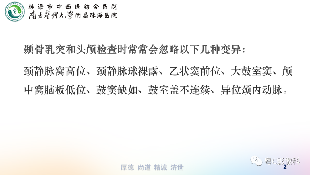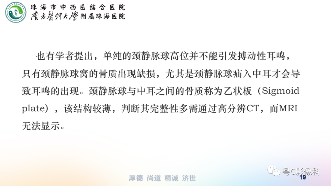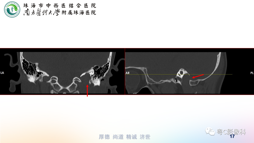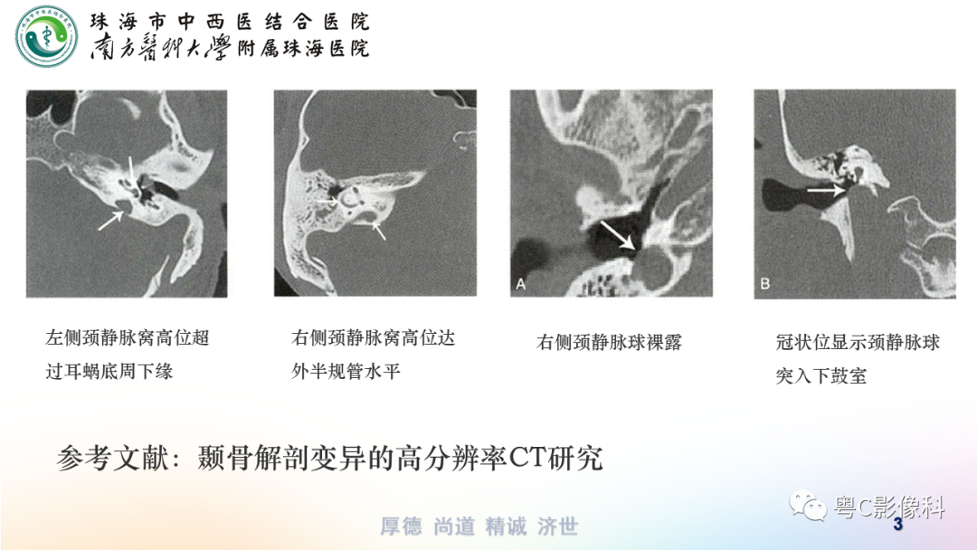 总结:乙状窦前位及颈静脉球高位是在CT检查中容易忽略的两种变异,但如果认识到它的影像特点,尤其是颞骨乳突部高分辨CT扫描,通过多平面的重建图像,很容易精确诊断,既能帮助临床医生了解部分搏动性耳鸣患者的发病原因,又能提示和引导临床医师了解乙状窦和高位颈静脉球与邻近重要结构的位置关系,在保护好颈内静脉的同时彻底清除病变。