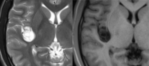 MRI:右侧岛叶多房囊状异常信号,边缘清楚,「瘤内分隔」,T1WI 低信号,T2WI 高信号,Flair「环形征」;PET-CT:低密度灶,低代谢。