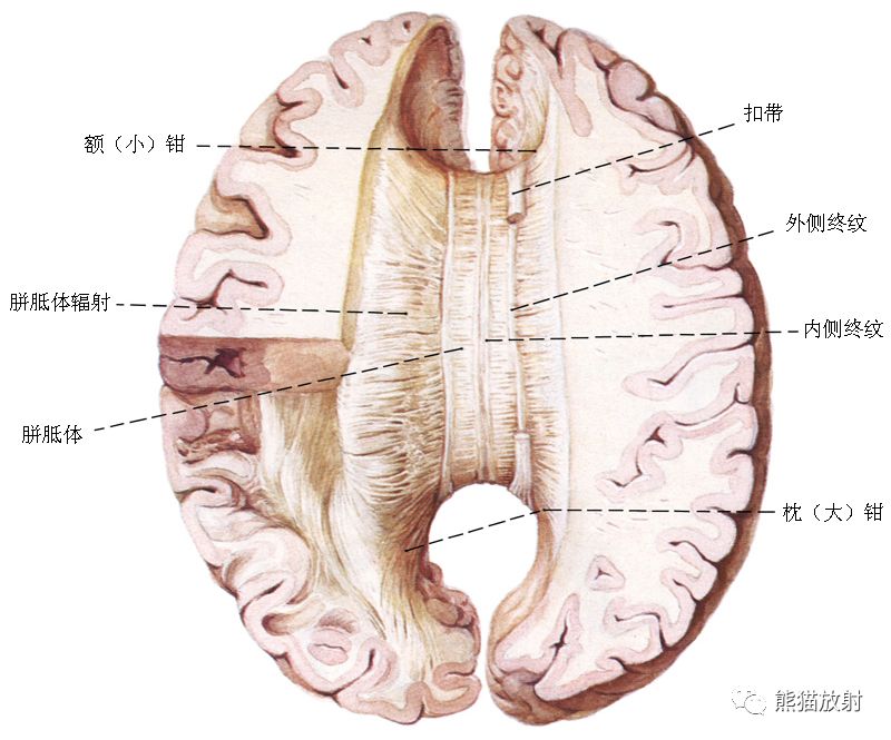 胼胝体作为连接左右两侧大脑半球最大的连合纤维,由2亿到8亿个神经纤维构成。胼胝体是由两部分分别发育而成,腹侧由膝部和体部构成,连接额叶;背侧由胼胝体压部和所附的海马连合构成,连接顶叶和穹窿。胼胝体早在胚胎时期就开始发育,孕12周时胼胝体纤维跨过中线,首先形成膝部,随后形成体部和压部,最后形成嘴部,整个过程到孕20周完成。因此当观察到20周以后的胎儿(通常行MRI的胎儿在20-22周以后)胼胝体膝部未发育时,它的整个胼胝体都是缺如的;或胼胝体体部部分缺如者,它的压部和嘴部也应当是缺如的。观察胼胝体时,应特别注意胼胝有无嘴部,从而判断胼胝体发育的完整性。