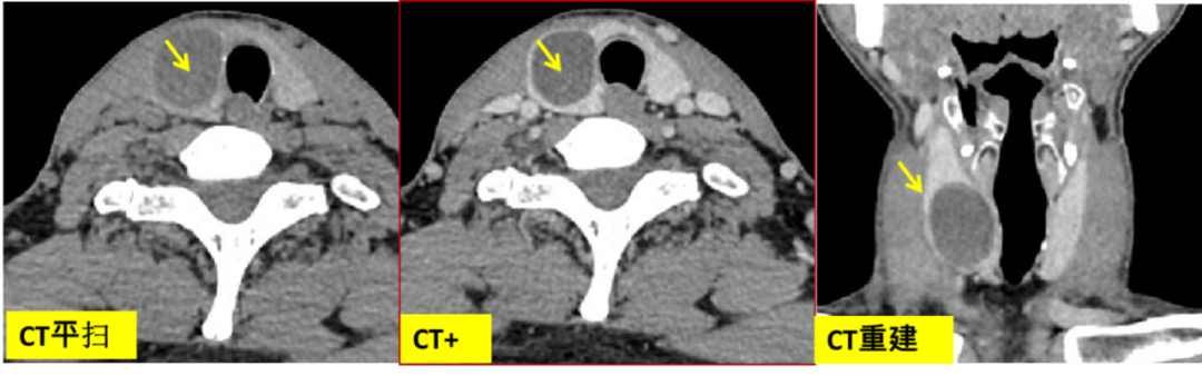 双侧甲状腺多发低密度结节,边缘模糊;增强后双侧多发结节较平扫清晰