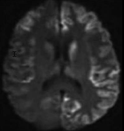 病例2:男,70岁。DWI轴位:双侧尾状核、丘脑及大脑皮层呈高信号。